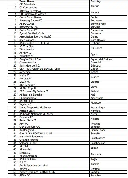 Les 54 clubs engagés pour la Ligue des champions africaine 2023/24