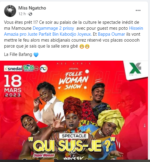 « Vous êtes prêt !!? Ce soir au palais de la culture, le spectacle inédit de ma Mamoune Degammage 2 prissy. Il y aura pour guest mes poto Hissein Amazia pro, Juste Parfait Bin Kabodjo Joyeux, et t Bappa Oumar. Ils vont mettre le feu, alors mes Abidjanais courrez réserver vos places, parce que je sais que la salle sera gbé », a-t-elle écrit.