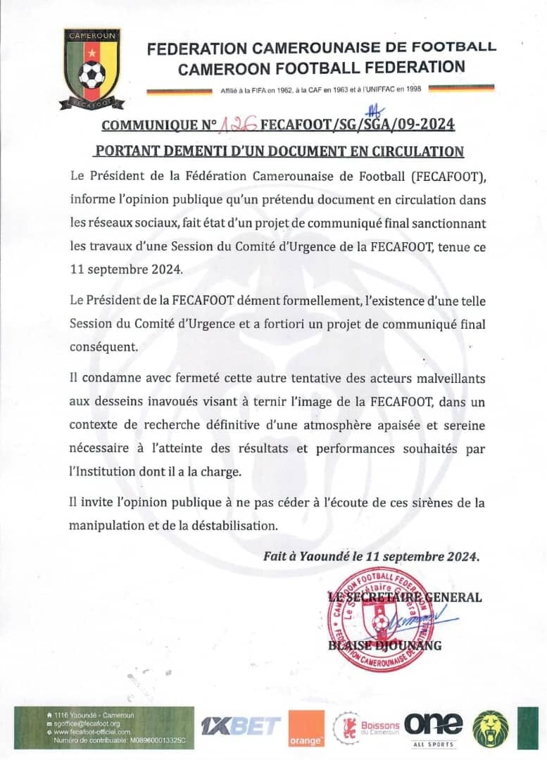 Très attendue pour confirmer ou infirmer cette grosse nouvelle, la FECAFOOT a finalement réagi. Dans un communiqué officiel ce mercredi soir, l’administration de Samuel Eto’o a apporté un démenti formel. Pour la Fédération camerounaise de football, « cette tentative des acteurs malveillants aux desseins inavoués visent à ternir l’image de la FECAFOOT ».