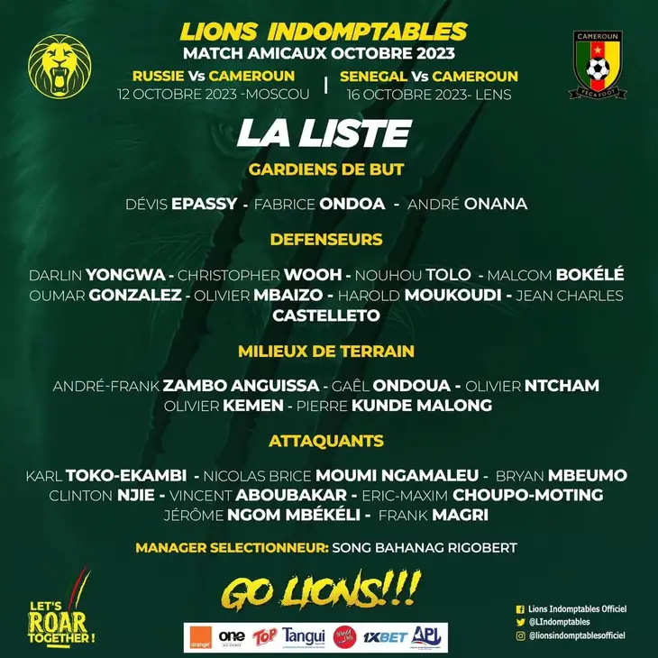 Il convient de noter également la présence de l’attaquant du Toulouse FC, Frank Magri, originaire d’Agen (France), qui a choisi de représenter la sélection camerounaise.