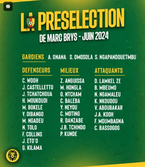 Le nouvel entraîneur des Lions Indomptables du Cameroun, Marc Brys, a révélé sa première liste. Plusieurs joueurs importants de l’équipe ont été appelés.