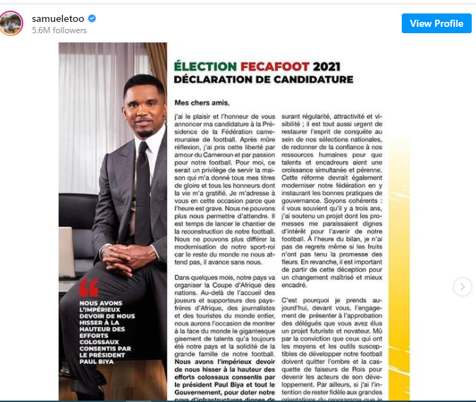« Je suis honoré et heureux d’annoncer ma candidature à la Présidence de la Fédération de Football de Cameroun. Après mûre réflexion, j’ai décidé de prendre cette initiative par amour pour le Cameroun et par passion pour notre football. Pour moi, ce serait un honneur d’être au service de l’établissement qui m’a décerné toutes les distinctions que j’ai reçues jusqu’à présent. Je me tiens devant vous en cette occasion spéciale parce que le temps presse. Attendre n’est pas une option. Il est temps de reconstruire notre football. Nous ne pouvons plus retarder la refonte de notre sport numéro un car le reste du monde avance il avance sans nous. », a déclaré la légende du football camerounais Samuel Eto’o, sur sa page Instagram. Il annonce en parallèle qu’il s’engage à ne pas prendre le moindre salaire relatif à sa fonction s’il est élu.