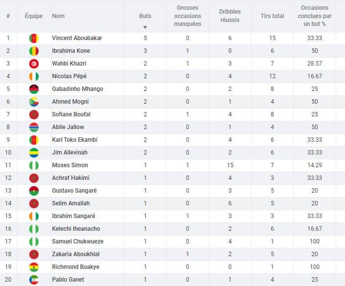 L’attaquant Camerounais est suivi de prêts par le Malien Ibrahima Koné qui en est déjà à 3 buts dans la compétition. Derrière, 7 joueurs comptent deux buts jusqu’ici dans cette CAN entre autres Nicolas Pépé, Whabi Khazri, ou encore Charles Toko Ekambi.