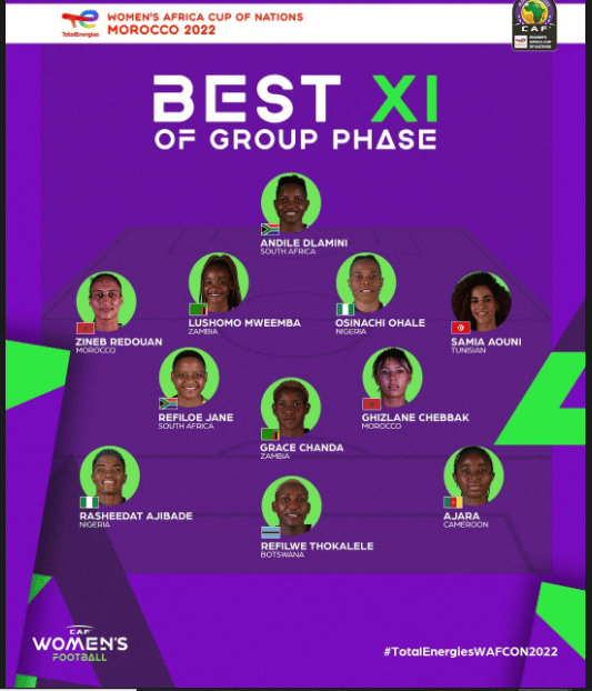 Quatre sélections ont placé deux joueuses dans ce onze notamment, le Maroc (pays-hôte), l’Afrique du Sud, auteur d’un sans-faute, ainsi que la Zambie et le Nigeria. Tous qualifiés pour les quarts, le Cameroun, la Tunisie et le Botswana placent quant à eux une joueuse. Élue meilleure joueuse de la phase de groupes, la milieu marocaine Ghizlane Chebbak fait évidemment partie de ce onze, tout comme la nigériane Rasheedat Ajibade, elle aussi très en vue, ou encore la star camerounaise, Ajara Nchout.