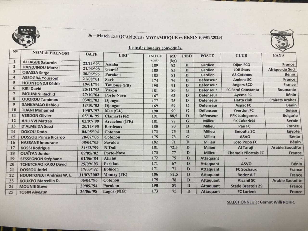 Le sélectionneur national du Bénin, Gernot Rohr, a dévoilé ce jeudi sa liste des joueurs retenus pour affronter le Mozambique en septembre prochain, dans le cadre de la 6è journée des éliminatoires de la CAN 2023.