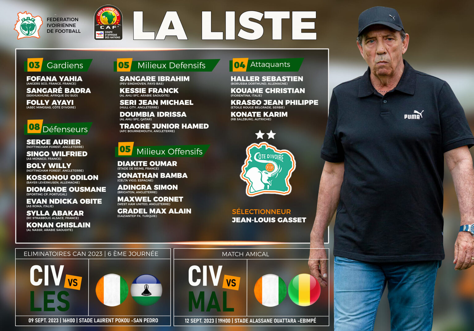 Pour ces deux échéances sans enjeu, le sélectionneur Jean-Louis Gasset a dévoilé la liste des joueurs retenus. Le technicien français a fait appel à 25 joueurs dont 3 gardiens, 8 défenseurs, 10 milieux et 4 attaquants. Dans ce groupe, on retrouve les éternels habitués, notamment Max-Alain Gradel, Wilfried Singo, Ghislain Konan, Franck Kessié, Jean-Michael Seri, Ibrahim Sangaré ou encore Badra Ali Sangaré.