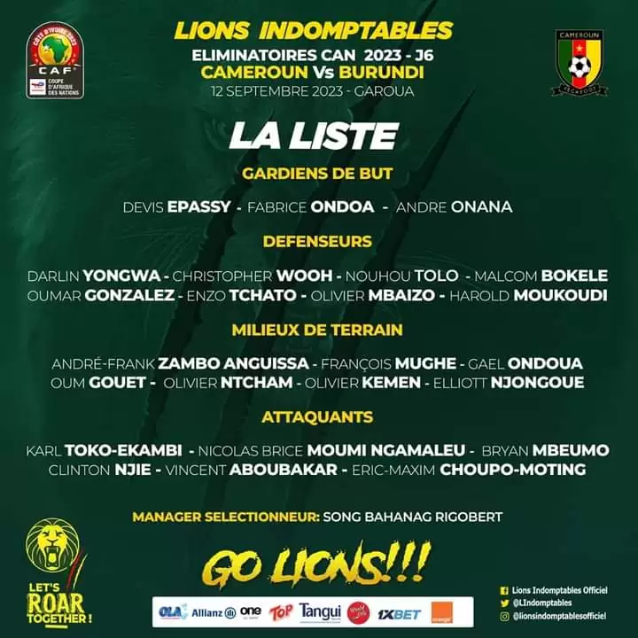 CAN 2023 (Q): la liste du Cameroun face au Burundi avec André Onana et Clinton N’jie