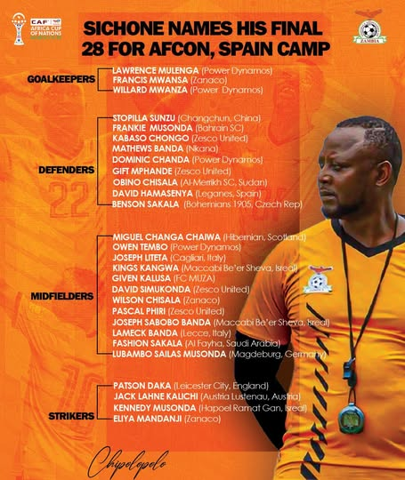 Le sélectionneur national de la Zambie, Moses Sichone, a communiqué la liste des joueurs retenus pour la phase finale de la CAN 2025. Le tournoi aura lieu au Maroc, du 21 décembre 2025 au 18 janvier 2026. Le coach des Chipolopolos a fait appel à un groupe de 28 hommes.