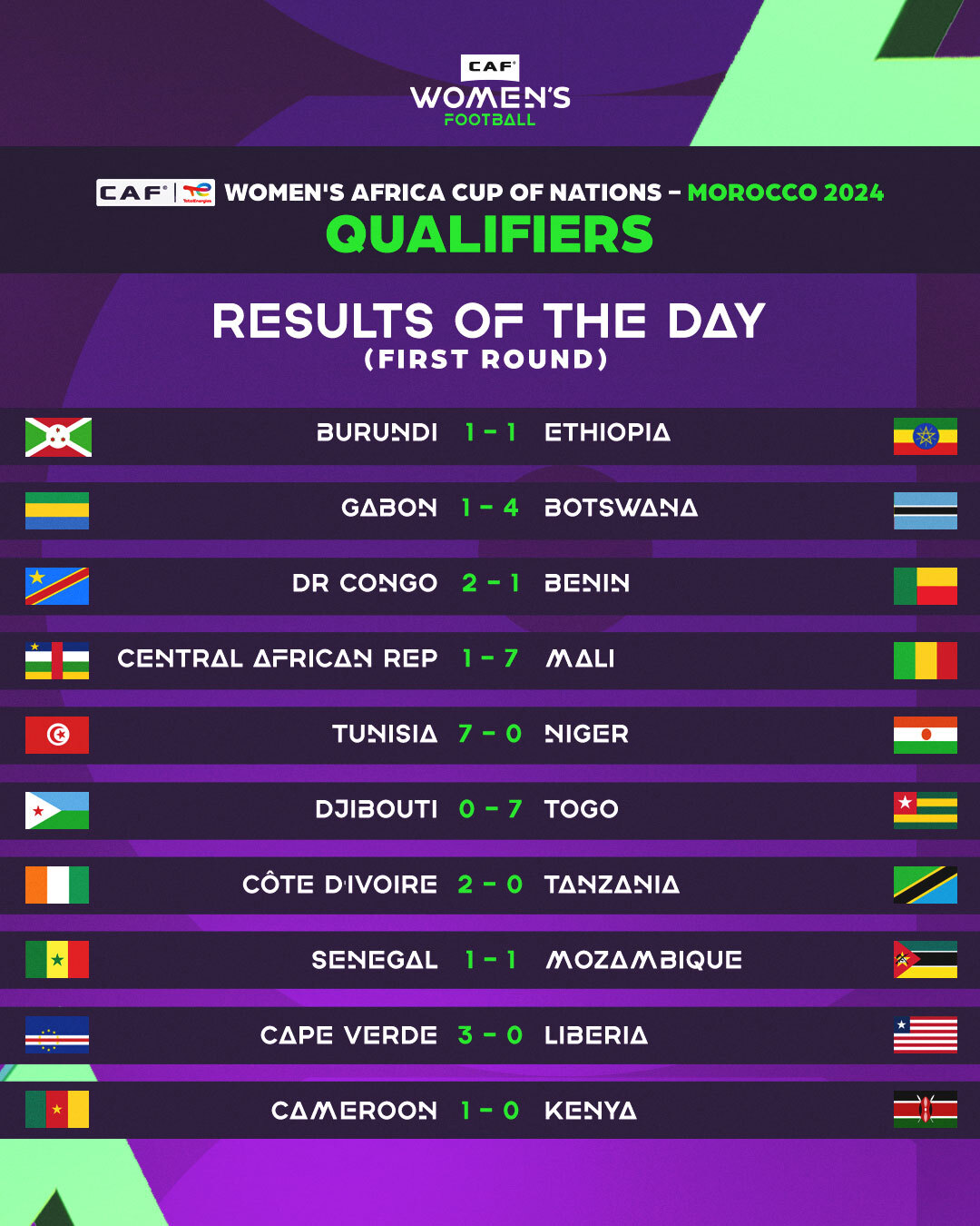 Découvrez les résultats des rencontres disputées vendredi à travers le continent, comptant pour le premier tour aller des éliminatoires de la CAN féminine 2024.