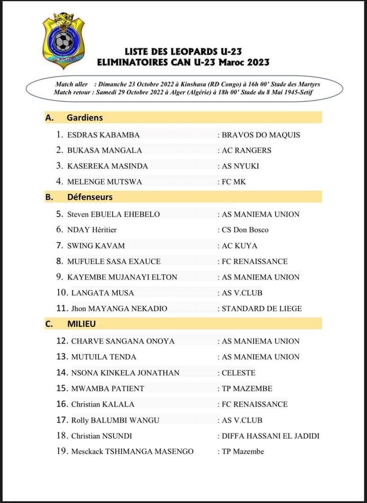 CAN U23 (Q): la liste de la RDC contre l’Algérie avec 5 joueurs de TP Mazembe