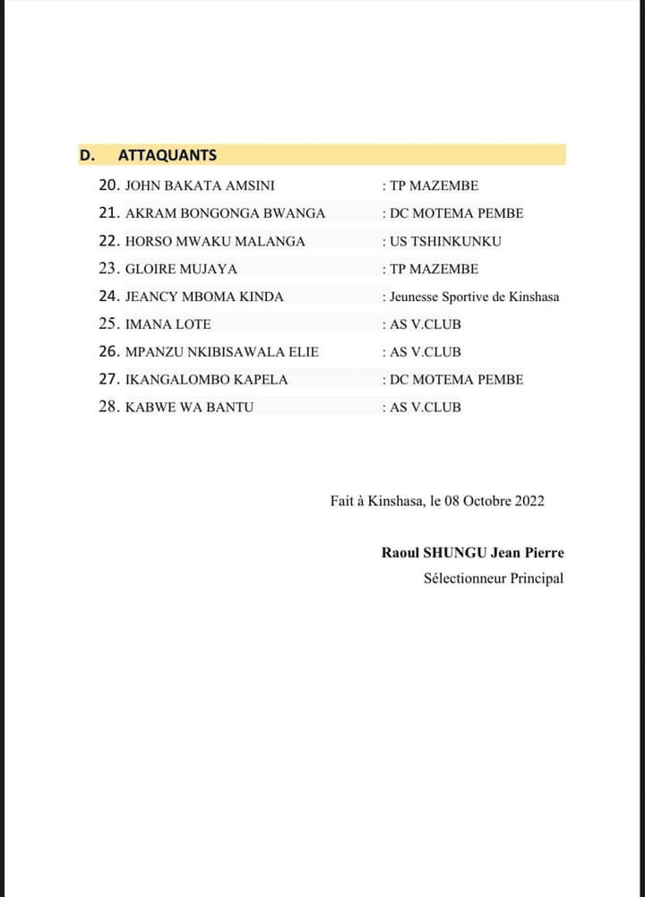 Le sélectionneur de la RDC, Raoul Shungu, a publié ce mardi sa liste des joueurs retenus pour la double confrontation face à l’Algérie, dans le cadre des éliminatoires de la CAN U23. 5 joueurs du TP Mazembe figurent dans le groupe.