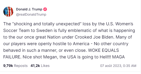 « La perte ‘choquante et totalement inattendue’ de l’équipe de football féminine des États-Unis contre la Suède est pleinement emblématique de ce qui arrive à notre autrefois grande nation sous Joe Biden. Beaucoup de nos joueuses étaient ouvertement hostiles à l’Amérique. Aucun autre pays ne s’est comporté d’une telle manière. Woke égal échec. Joli tir Megan, les USA vont en enfer !!!« , a-t-il écrit. Une rengaine finalement habituelle chez l’homme d’affaires.