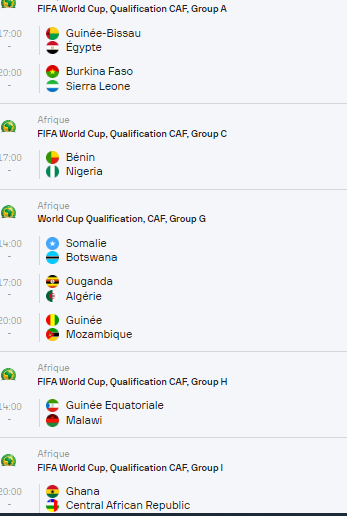 Outre ce duel prometteur entre le Bénin et le Nigéria, 7 autres rencontres sont au programme ce jour dans le cadre de la quatrième journée des éliminatoires du mondial 2026 dans la zone Afrique.