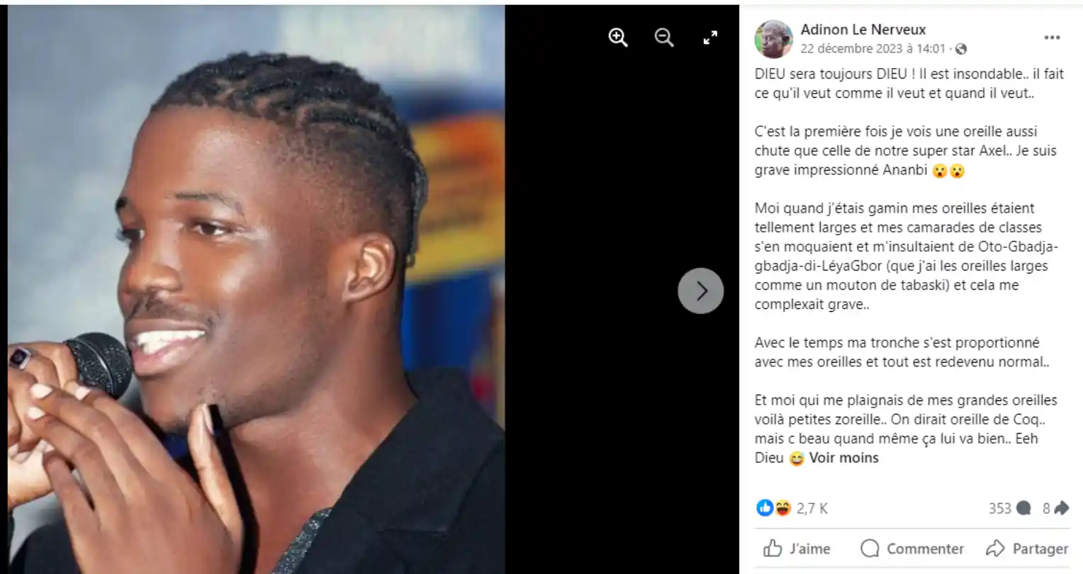 Dans une publication sur sa page Facebook, Adinon le nerveur s’est exprimé sur les oreilles d’Axel Merryl en faisant un témoignage sur la beauté de la différence.