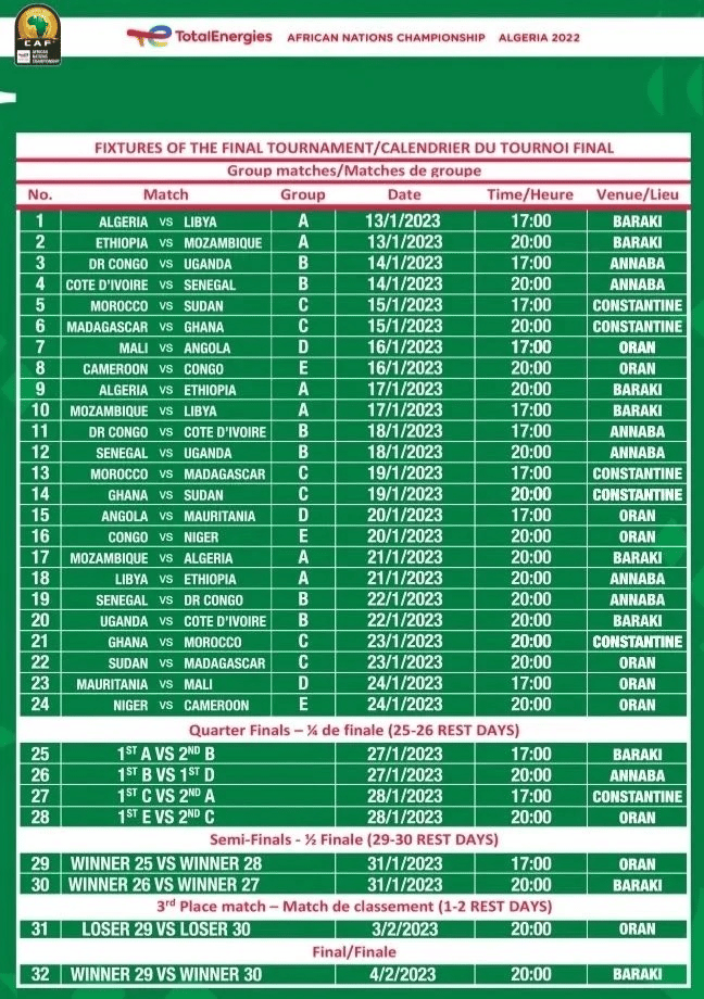 La CAF a dévoilé le calendrier du Championnat d’Afrique des nations 2023. Le tournoi aura lieu du 13 janvier au 4 février en Algérie.