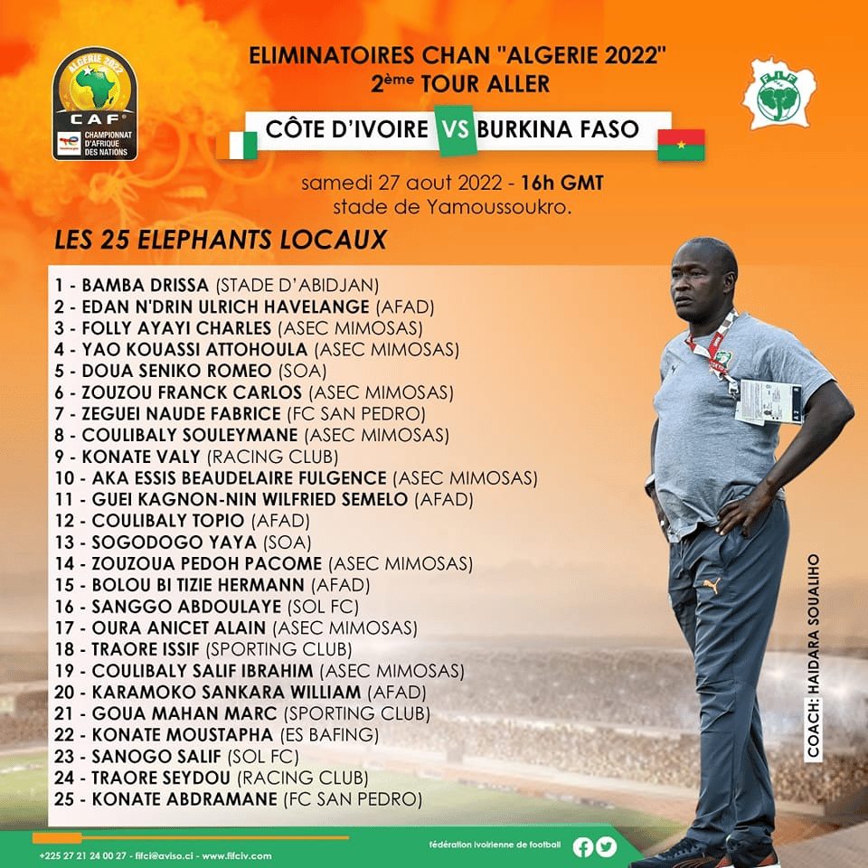 La Côte d’Ivoire a publié ce jeudi sa liste des joueurs convoqués pour la réception du Burkina Faso (samedi) en éliminatoire du CHAN 2023.