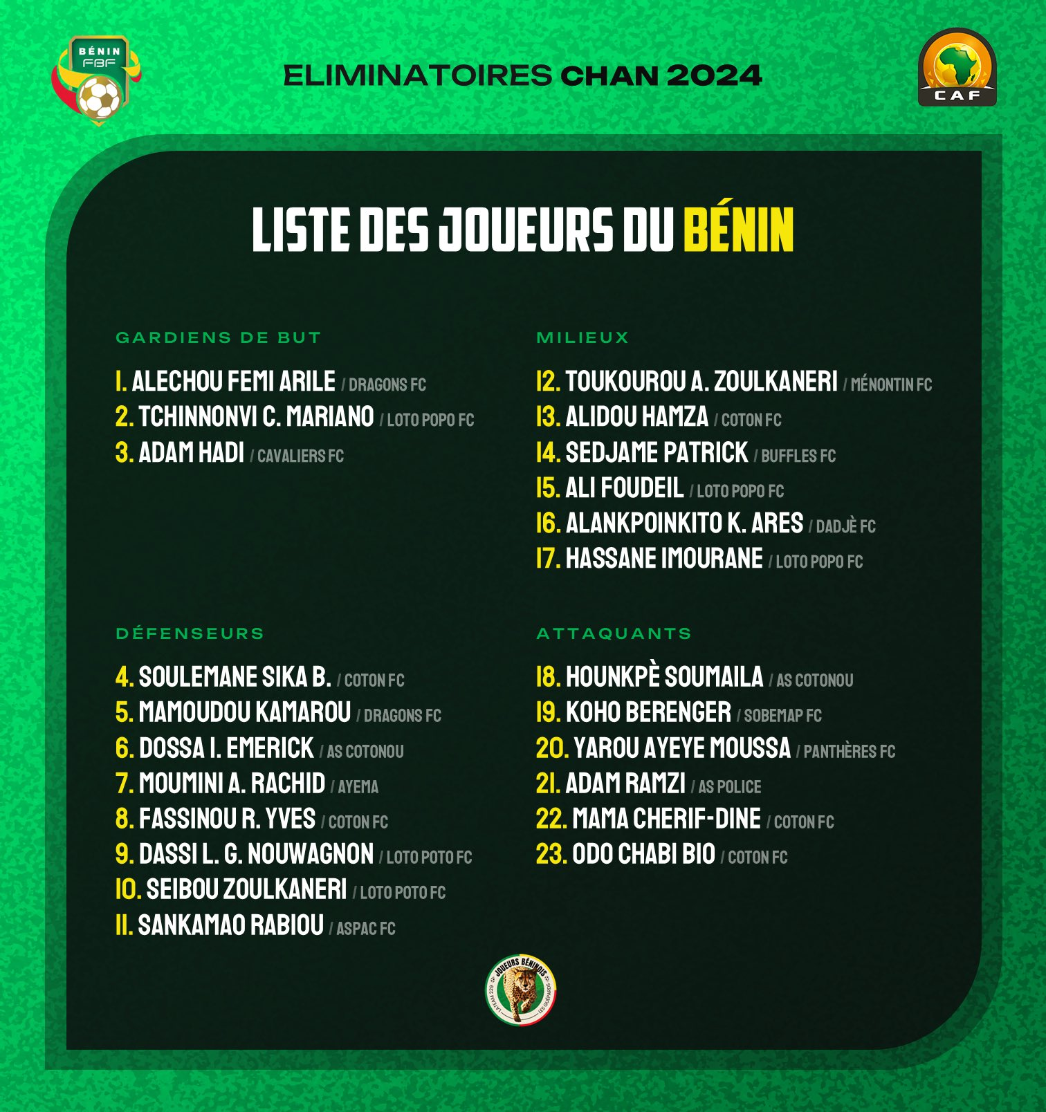 CHAN 2024 (Q): la liste du Bénin pour affronter le Togo