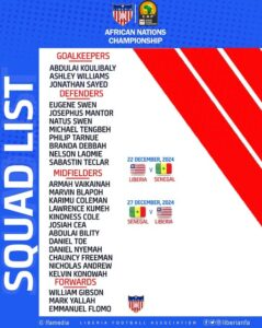 Le Libéria a dévoilé sa liste des joueurs retenus pour affronter le Sénégal à l’occasion du deuxième tour des éliminatoires du CHAN 2025.