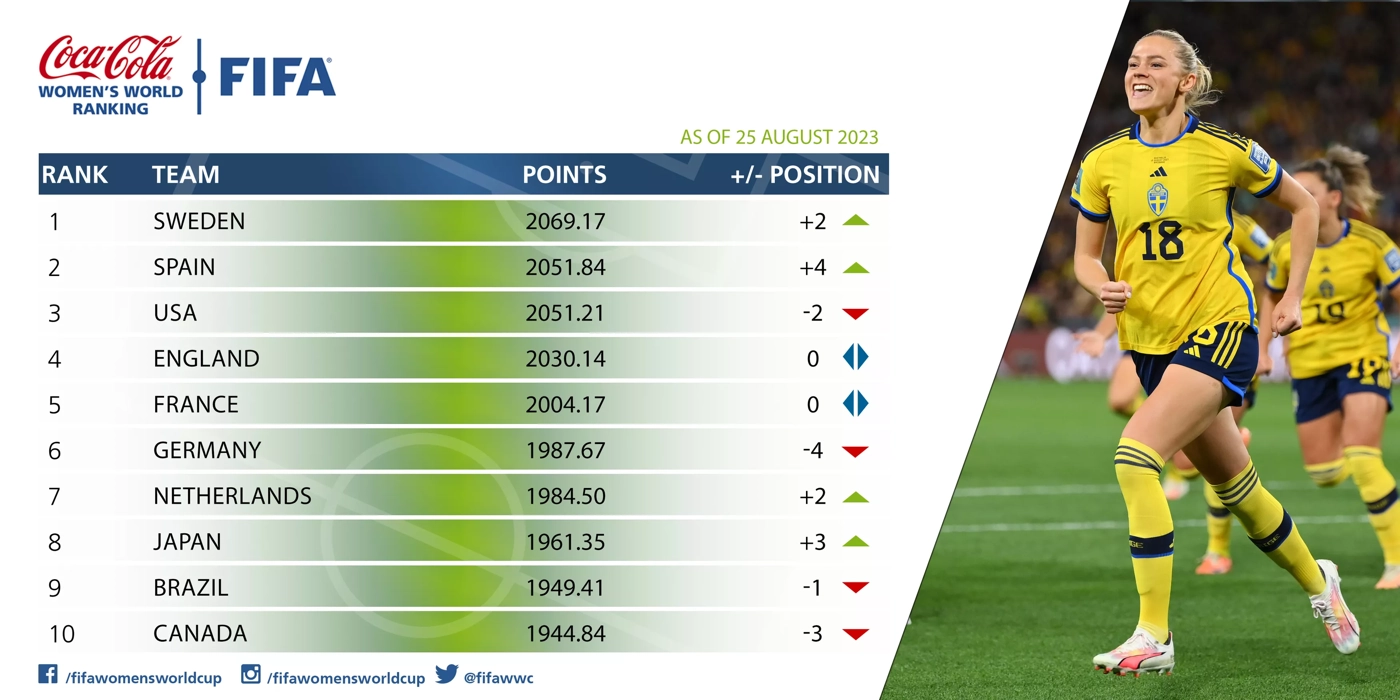 Dans le top 10, l’Espagne gagne 4 places et monte à la deuxième position (2e, +4). «Les championnes du monde auraient même pu s’adjuger la première place si elles n’avaient pas laissé échapper 35 points en perdant lourdement (4-0) contre le Japon lors de leur dernier match de groupe», explique la FIFA. La première place au classement est allée à la Suède (1ère, +2), qui détrône les Etats-Unis, relégués à la dernière manche dans le top 3. «Les Scandinaves détrônent les Etats-Unis (3e, -2) qu’elles ont éliminées en huitième de finale avant d’échouer dans le dernier carré et de rebondir contre l’Australie dans le duel pour la troisième place», détaille l’instance dirigeante du football mondial.