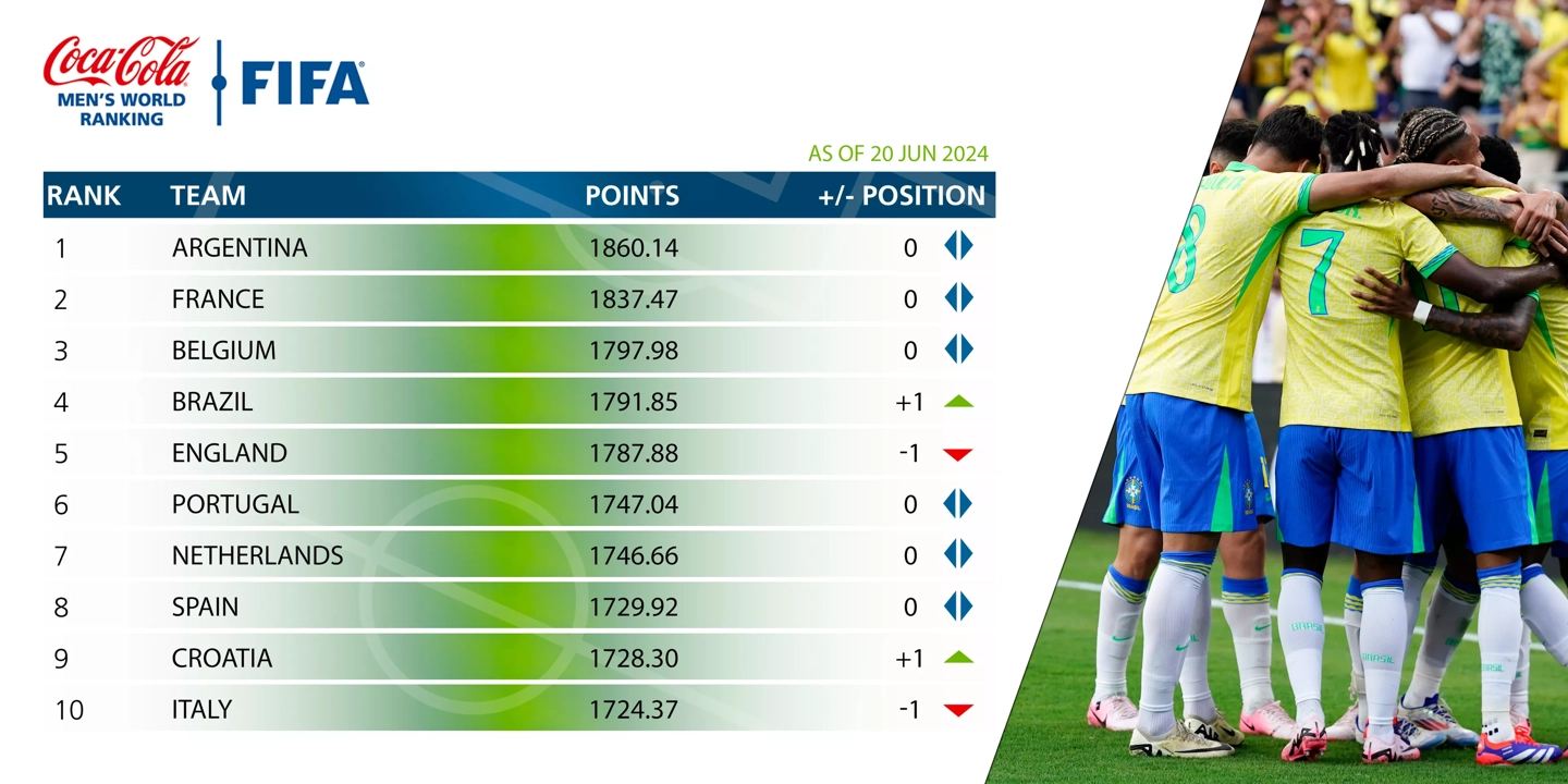 Classement FIFA juin 2024: l’Argentine toujours en tête, le Brésil 4è, le top 10 mondial