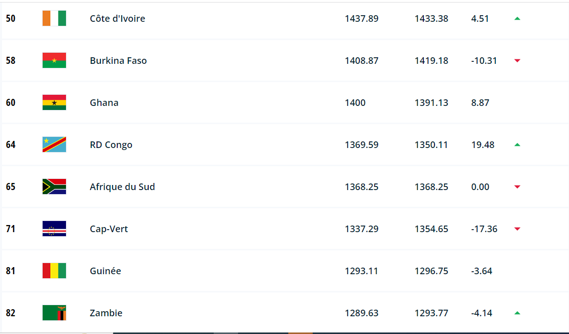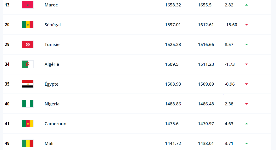 En haut du tableau sur le continent, le Maroc conserve son trône devant le Sénégal (2è), la Tunisie (3e), l’Algérie (4e) et l’Egypte (5e). Les Lions de l’Atlas gagnent même une place au classement mondial, et retrouvent désormais la 13è loge, devant la Suisse. Un petit bond dû au court succès des Marocains contre le Burkina Faso (1-0), le 12 septembre à Lens (France).