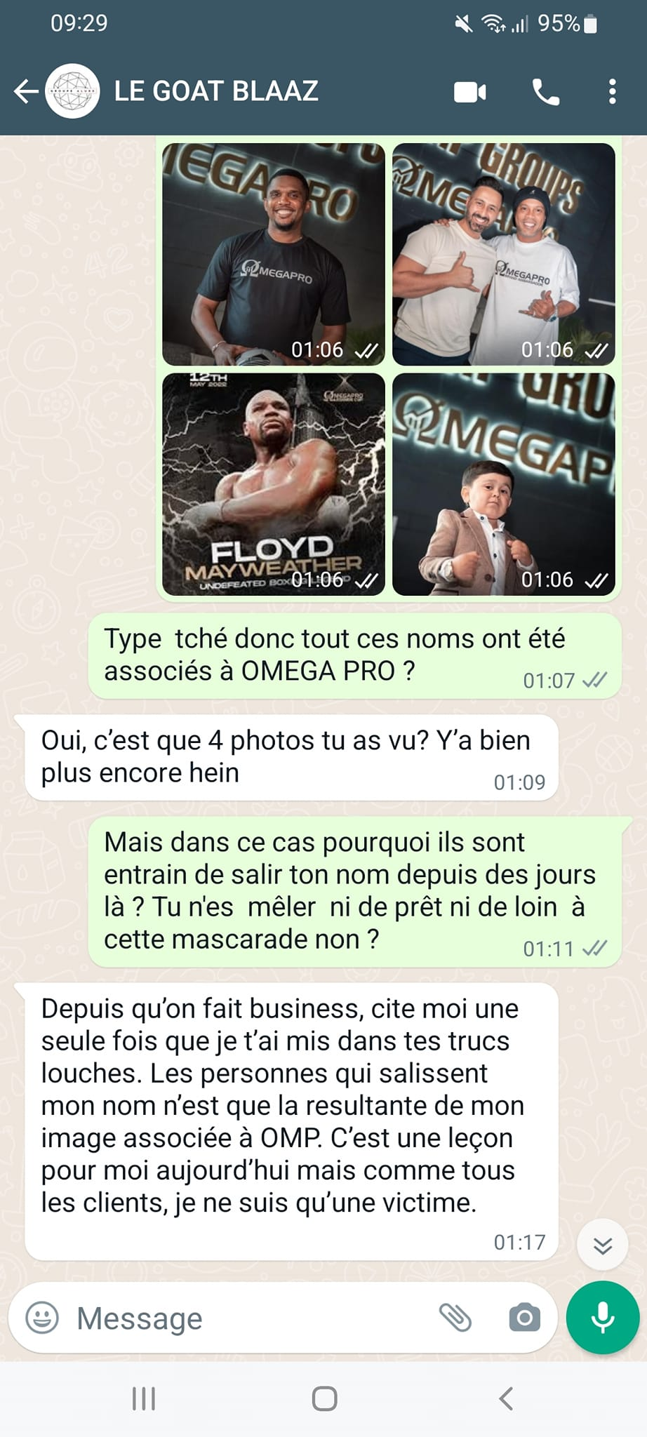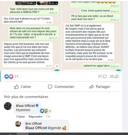 Interrogé sur la situation lors d’une discussion privée avec l’un de ses proches, Blaaz a tenté de justifier sa participation. Selon lui, il n’est pas la seule célèbrité à être associé à Omega Pro. « Ce n’est que 4 photos que tu as vues. Il y en a bien d’autres encore… », a justifié l’artiste avec des images de plusieurs autres stars qui ont également pris parti pour Omega Pro.