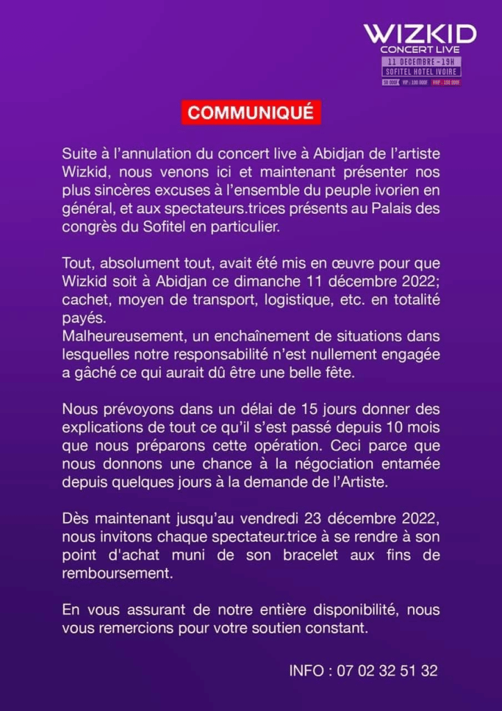 Pour les organisateurs, rien ne justifie l’annulation de ce concert car, tout avait été mis en œuvre pour que Wizkid soit à Abidjan ce dimanche 11 décembre 2022 ; cachet , moyen de transport , logistique , etc. en totalité payés .