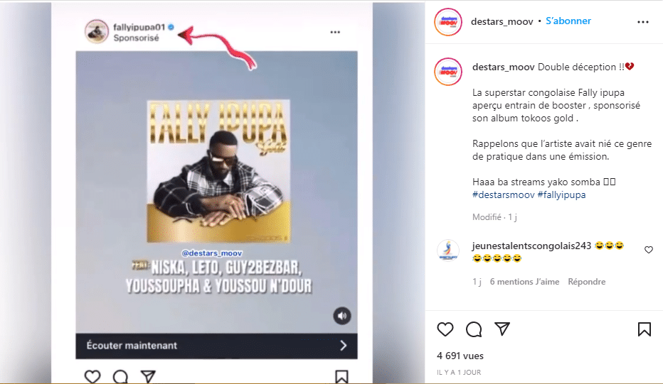 En effet, Il s’agit d’une image montrant Fally, en train de faire recours à la régie publicitaire de Google, pour sponsoriser et booster son tout dernier titre : “100” sorti de la réédition de son album Tokooos. Publiée par le média congolais Destars, l’image a suscité une avalanche de réactions sur la toile. Plusieurs internautes se sont indignés contre le chanteur, l’accusant d’être un « voleur et menteur professionnel ».