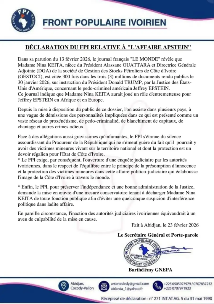 Côte d’Ivoire – Affaire Jeffrey EPSTEIN : le FPI demande le limogeage de Nina KEITA