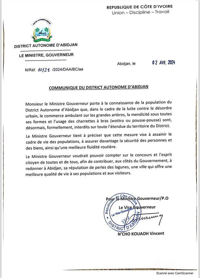 En Côte d’Ivoire, le ministre-Gouverneur du District Autonome d’Abidjan, Ibrahima Cissé Bacongo, souhaite informer la population que, dans le but de lutter contre le désordre urbain, le commerce ambulant sur les principales artères sont interdits.