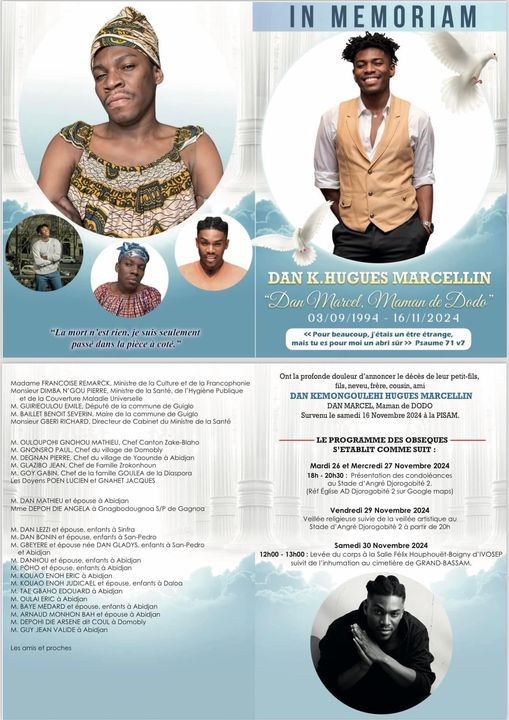 Le programme des obsèques de l’artiste et web humoriste ivoirien Dan Marcel, connu sous le pseudonyme de Maman de Dodo a été dévoilé.
