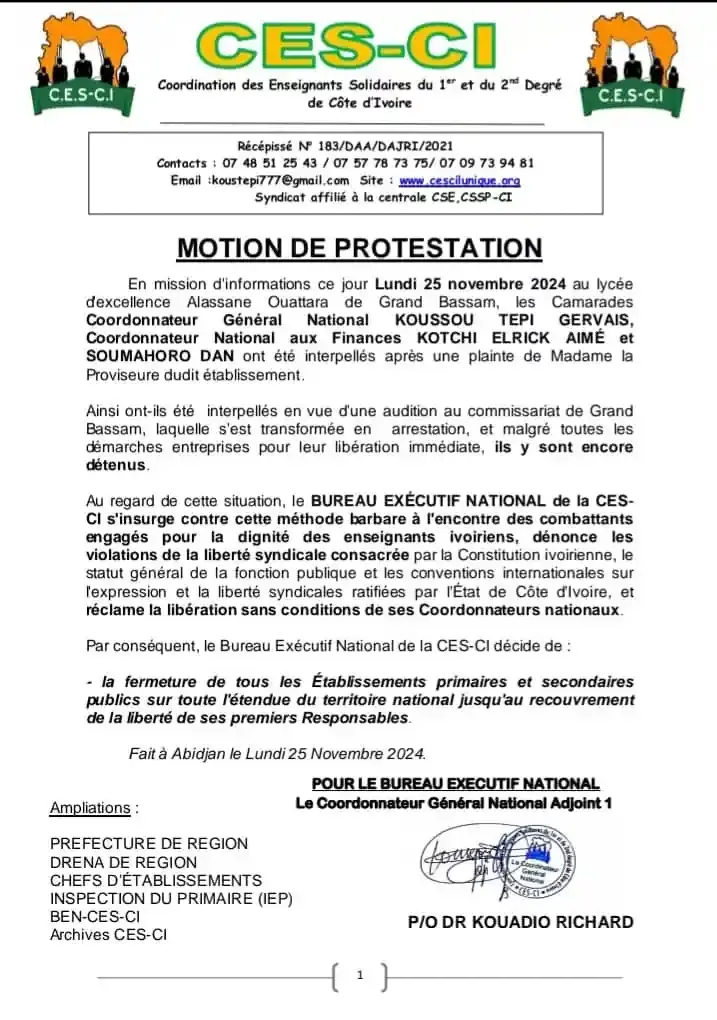 La CES-CI a dénoncé ces interpellations, qu’elle considère comme une atteinte grave à la liberté syndicale, et exige la libération immédiate des dirigeants concernés. En signe de protestation, les enseignants ont suspendu les activités scolaires, exigeant la satisfaction de leurs revendications avant toute reprise.