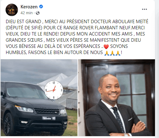 Le chanteur Kérozen est reconnaissant envers le député ivoirien Abdoulaye Méité. Selon les confidences de Kérozen, Me Abdoulaye Ben Méïté lui a offert une voiture neuve. « Dieu est grand , merci au président, Docteur Aboulaye Meïté (député de Sifié) pour ce range rover flambant neuf. Merci vieux, Dieu te le rende », a exprimé Kérozen.