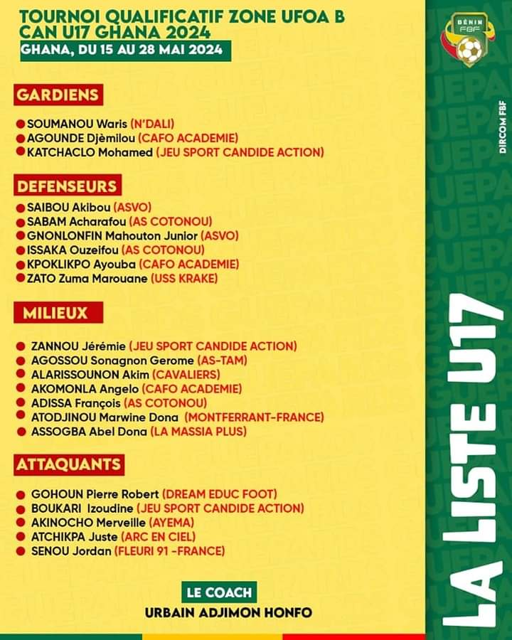 Le technicien béninois Urbain Honfo a dévoilé la liste des Guépards retenus pour le tournoi de qualification de la Zone Ouest B (UFOA B) pour les sélections masculines U17. La compétition se déroulera au Ghana, du 15 au 28 mai 2024.