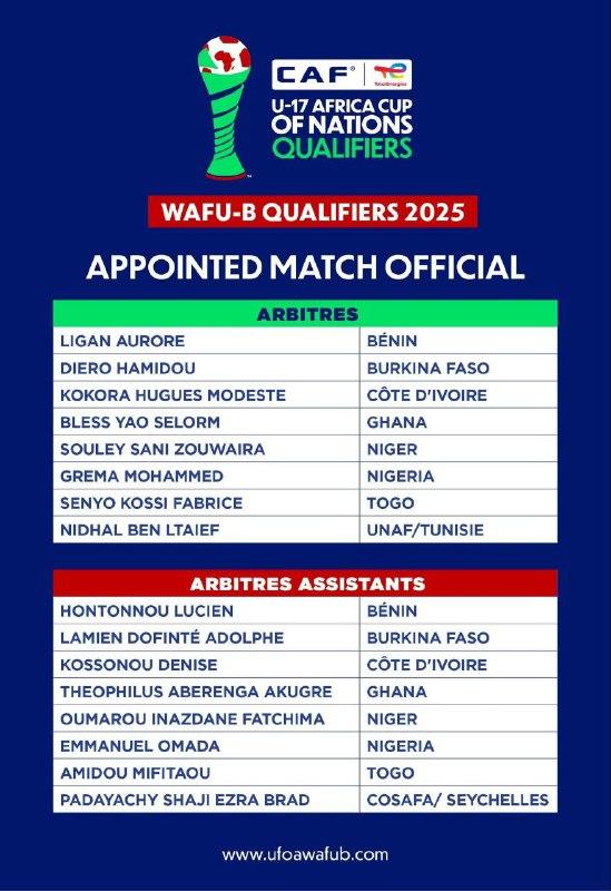 La Confédération Ouest B de l’UFOA a dévoilé la liste des officiels désignés pour le tournoi qualificatif à la Coupe d’Afrique des Nations U17, prévu du 20 septembre au 3 octobre 2025 à Yamoussoukro, en Côte d’Ivoire.