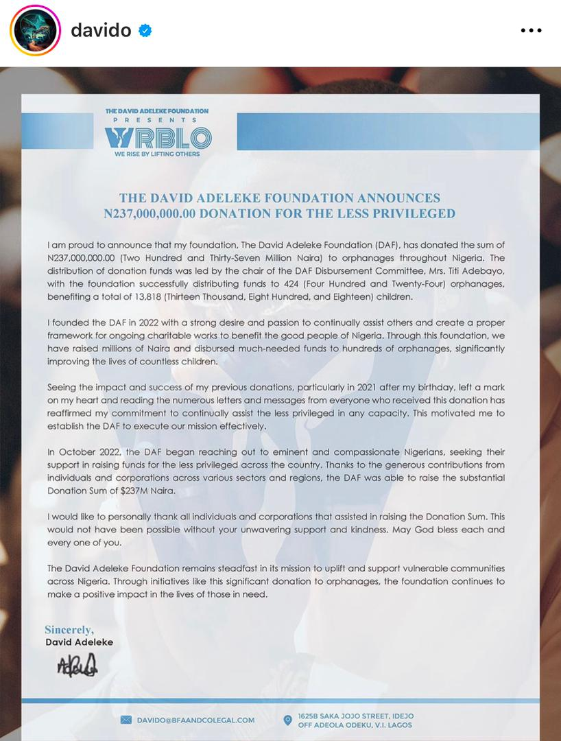 C’est à travers un communiqué publié sur sa page Instagram, ce jeudi 20 juillet que Davido a annoncé la bonne nouvelle à ses fans. Il a exprimé sa gratitude envers ses fans et soutiens, reconnaissant qu’il est en mesure d’utiliser sa notoriété pour aider les autres et impacter positivement leur vie. Davido a souligné que cette tradition de dons aux orphelinats a débuté il y a quelques années, à l’occasion de son anniversaire, mais qu’il souhaitait aujourd’hui rendre cette initiative plus pérenne pour offrir un avenir meilleur à ces enfants vulnérables.