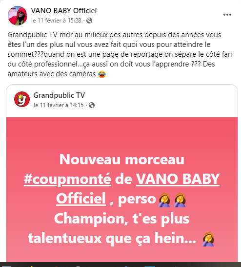 « Grandpublic TV mdr, au milieu des autres depuis des années, vous êtes l’un des plus nuls, vous avez fait quoi vous pour atteindre le sommet? Quand on est une page de reportage on sépare le côté fan du côté professionnel…ça aussi on doit vous l’apprendre? Des amateurs avec des caméras« , a répondu sèchement Vano visiblement très en colère.