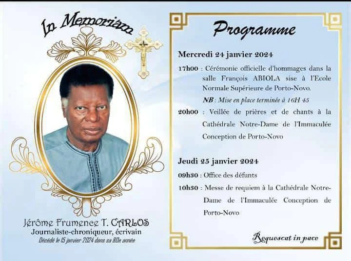 Décédé dans la soirée du lundi 15 janvier 2024, l’éminent journaliste, chroniqueur et écrivain Jérôme Carlos sera conduit à sa dernière demeure le jeudi 25 janvier 2023.