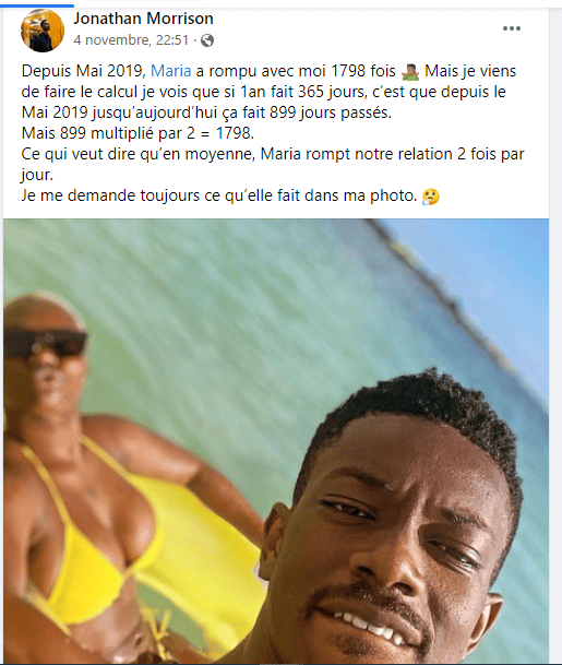 « Depuis Mai 2019, Maria a rompu avec moi 1798 fois. Mais je viens de faire le calcul et je vois que si 1 an fait 365 jours, c’est que depuis Mai 2019 jusqu’ aujourd’hui ça fait 899 jours passés. Mais 899 multiplié par 2 = 1798. Ce qui veut dire qu’en moyenne, Maria rompt notre relation 2 fois par jour », a-t-il écrit sur sa page Facebook. Dans son message, Jonathan Morrison a également demandé comment Maria Mobil s’arrange pour se retrouver dans ses photos.