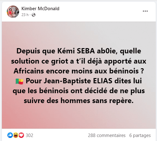 « Depuis que Kémi Seba aboie, quelle solution ce griot a t-il déjà apporté aux Africains encore moins aux béninois ? », a-t-elle demandé avant de régler ses compte avec Jean Batiste Elias. « Pour Jean-Baptiste Elias, dites lui que les béninois ont décidé de ne plus suivre des hommes sans repère », peut-on lire sur sa page Facebook.