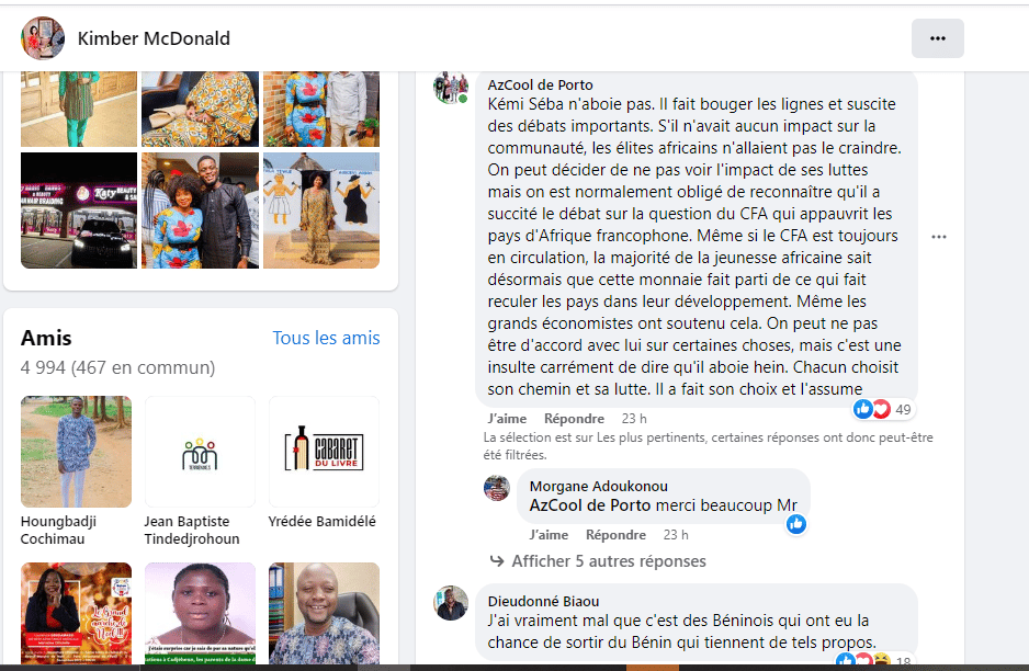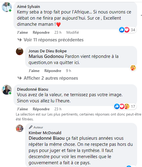 « Kemi seba a trop fait pour l’Afrique… Si nous ouvrons ce débat on ne finira par aujourd’hui. Sur ce , Excellent dimanche maman », a commenté un internaute. Comme lui, d’autres ont invité Kimber à ne pas mêler Kemi Seba à ces attaques sans fondement. « Vous avez de la valeur, ne ternissez pas votre image. Sinon vous allez lire l’heure », va prévenir un autre.