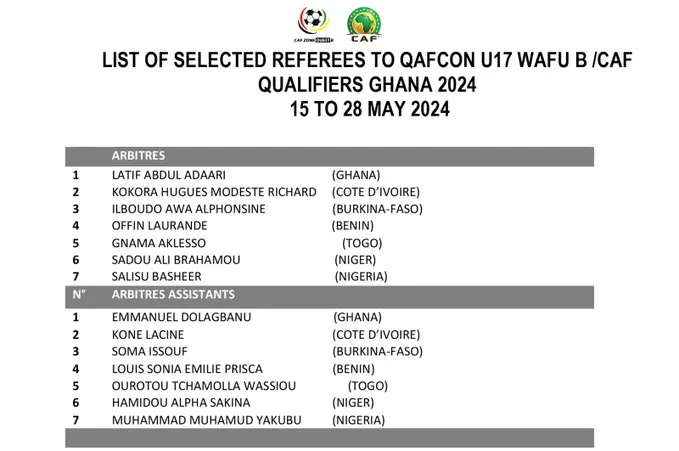 La liste des arbitres qui auront l’honneur d’officier lors du Tournoi UFOA-B U17, qualificatif pour la Coupe d’Afrique des Nations U17, a été dévoilée. Parmi les 14 arbitres sélectionnés pour cette compétition ouest africaine, deux arbitres béninoises ont été retenues, démontrant ainsi la qualité et le professionnalisme de l’arbitrage au Bénin.