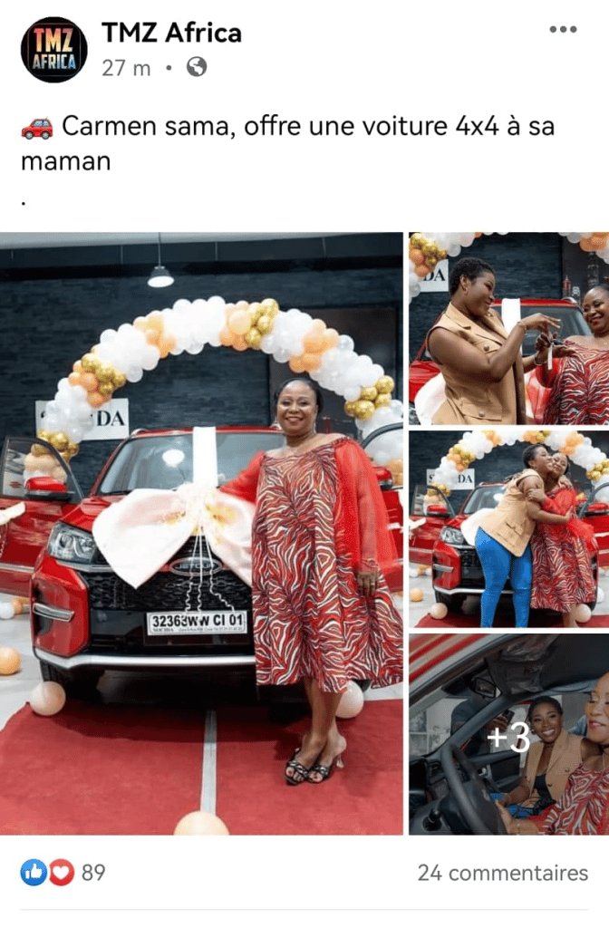 Pour rappel, plus tôt la semaine dernière, Carmen Sama, la veuve de la légende coupé décalé DJ Arafat s’est offert une voiture de 50 millions de Fcfa.