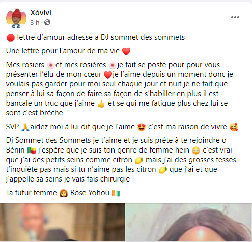 « Une lettre pour l’amour de ma vie. Mes rosiers et mes rosières, je fais ce poste pour vous présenter l’élu de mon cœur », a révélé Rose Yohou dans sa lettre d’amour. A l’en croire, elle est amoureuse de DJ sommet des sommets et ne voudrait plus le garder pour elle seule.