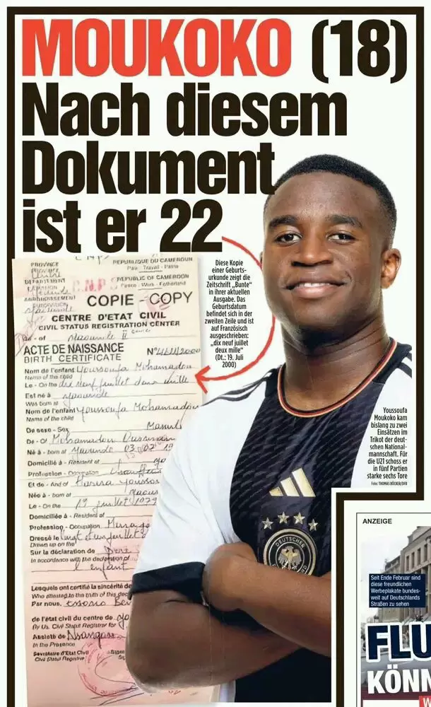 C’est le journal local, Bunte, qui a balancé ces allégations sur le natif de Yaoundé. Le journal a publié un prétendu certificat de naissance de l’ancien joueur du FC Sankt Pauli. Un document qui indique que le joueur né au Cameroun a vu le jour un 19 juillet 2000 et porte le nom de Youssoufa Mohamadou.