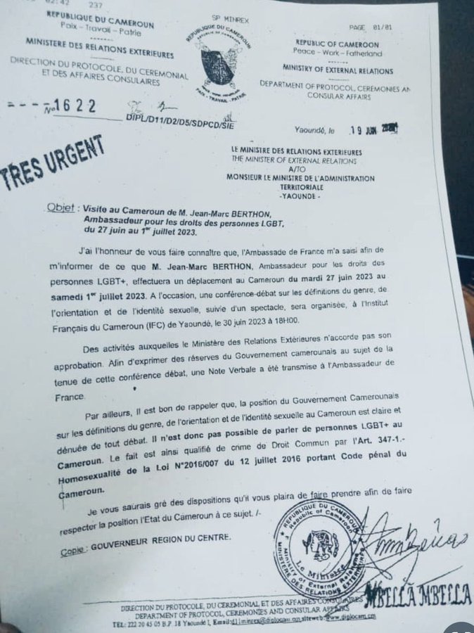 En réponse à cette demande, le ministre camerounais des Relations extérieures (Minrex) a suggéré à son collègue de l’Administration territoriale (Minat), d’interdire cette conférence sur l’homosexualité de Jean-Marc Berthon, ambassadeur français pour les droits des personnes LGBT+. Parallèlement, le ministre camerounais des Relations extérieures a saisi par note verbale, l’ambassadeur de France au Cameroun, Thierry Marchand, pour lui signifier sa désapprobation au sujet de l’objet de cette visite.