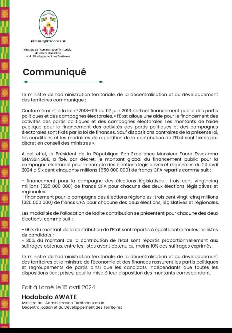 Au Togo, la dotation de l’Etat pour le financement des activités des formations politiques dans le cadre des prochaines élections est désormais connue. Le président Faure Essozimna Gnassingbé a fixé ce lundi 15 avril par décret, le montant global du financement public pour la campagne électorale pour le compte des législatives et régionales du 29 avril prochain à 650 millions FCFA.