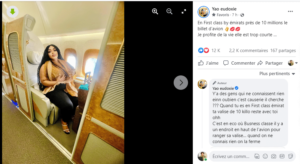 « En First class by émirats près de 10 millions le billet d’avion. Je profite de la vie, elle est trop courte », a-t-elle écrit sur sa page Facebook. Mais les internautes prennent ses informations avec réserve. « Il doit y avoir un chiffre de trop », fait remarquer un internaute.