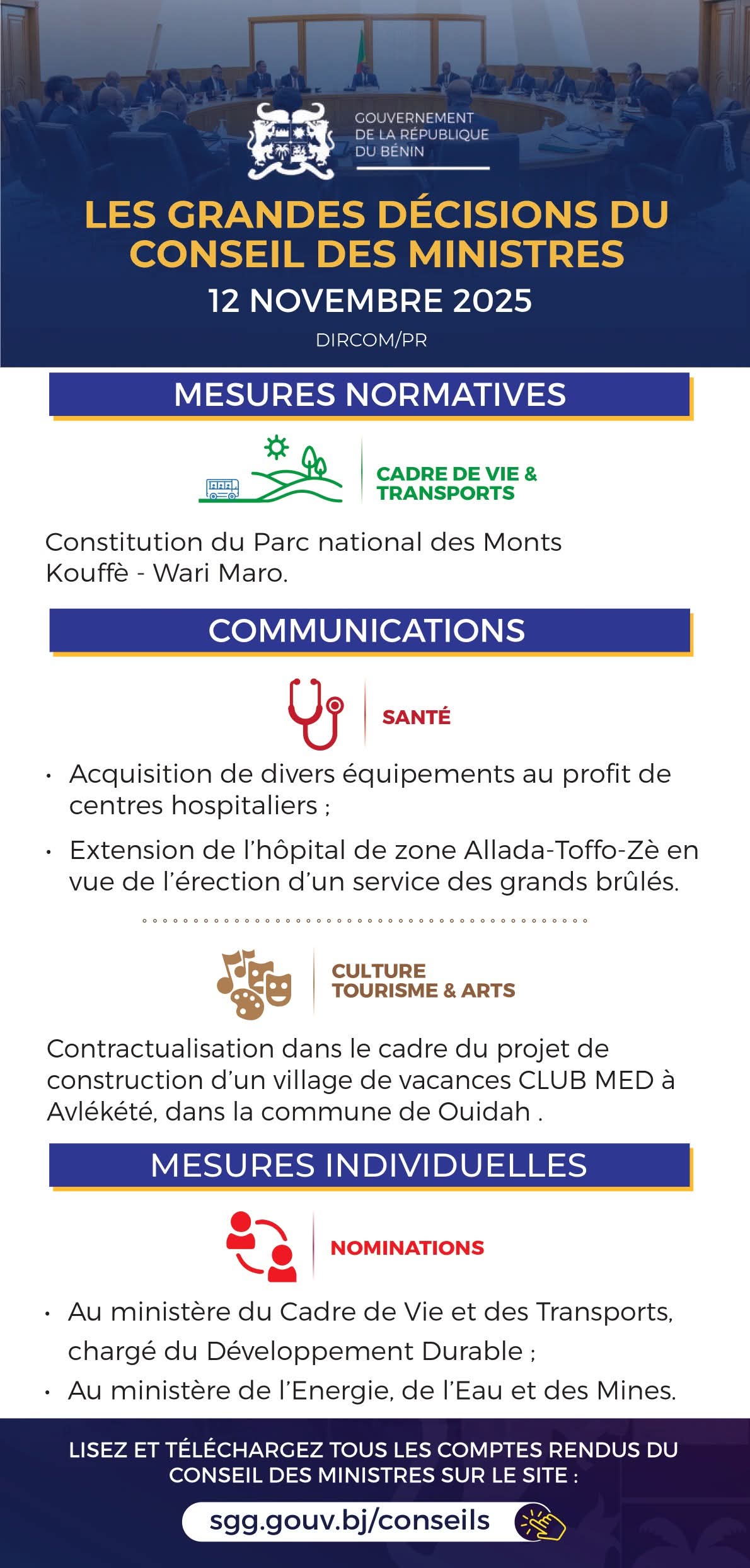 Meeting this Wednesday, November 12, 2025, the Beninese government made several major decisions as part of implementing its development action program.