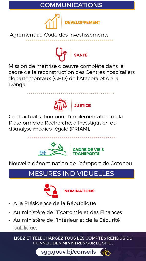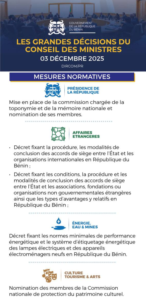 The Council of Ministers met on Wednesday, December 3, 2025, under the chairmanship of President Patrice Talon, Head of State, Head of Government. The following decisions were made: